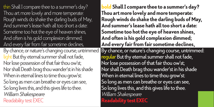 The Normal »EXEC«-family has 7 weights, ranging from Thin to Bold (plus 7 italics). This elegant Sans is suited for editorial, book text, advertising and packaging, logo, branding, small text as well as web and screen design.